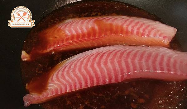 2.鯛魚片放入鍋內,使其浸泡在醬汁中