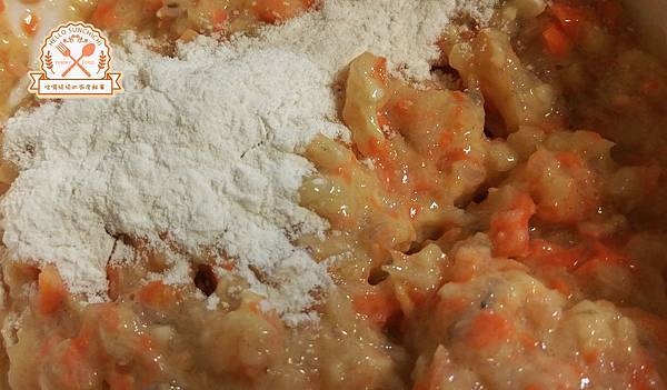 2.加入些許太白粉、米酒、白胡椒、鹽巴後,打入一顆蛋以及加入麵粉,攪拌至黏稠狀