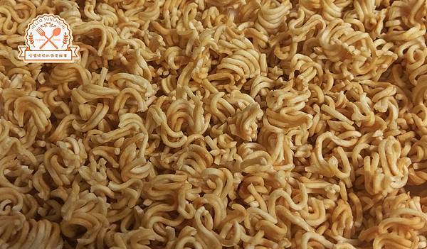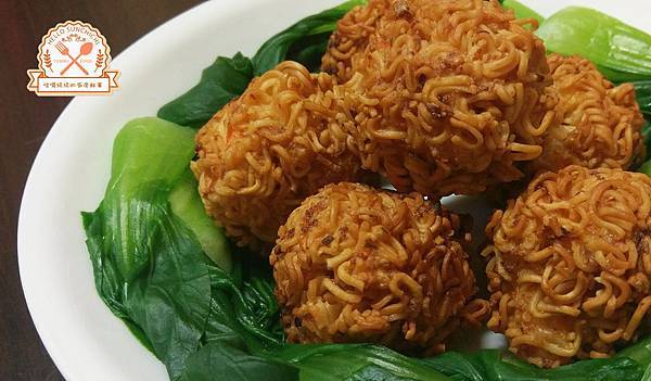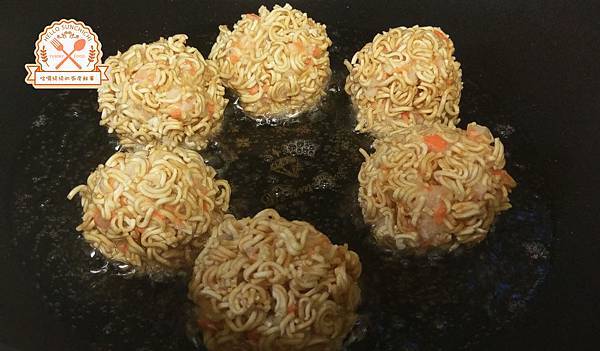 4.舀一些蝦漿,裹上泡麵麵餅,捏成球狀蝦球
