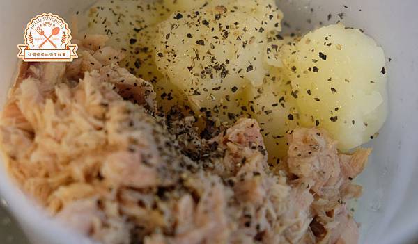 2.蒸軟後的馬鈴薯、水煮鮪魚,加入適量海鹽、黑胡椒粉。