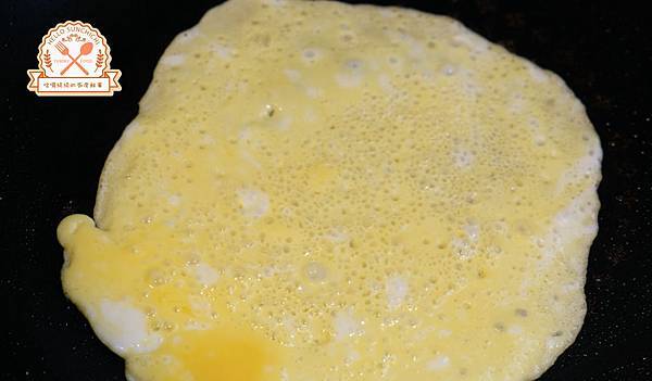 6.鍋內倒入油,用廚房紙巾把油均勻擦拭後,開火潤鍋後,倒入蛋液,等到蛋皮邊緣翹起後,就可以取出蛋皮。