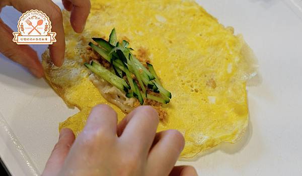7.取一張蛋皮,沾取一些馬鈴薯泥、放入肉鬆、小黃瓜絲。