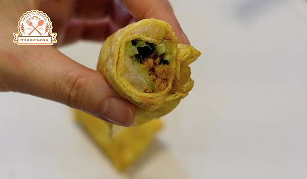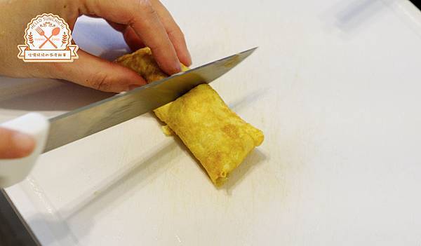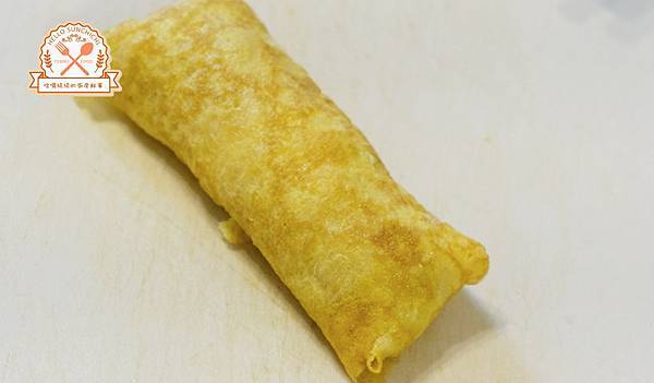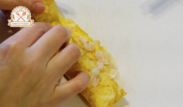 8.仔細將蛋皮包裹捲起來,馬鈴薯泥可以用來黏合。
