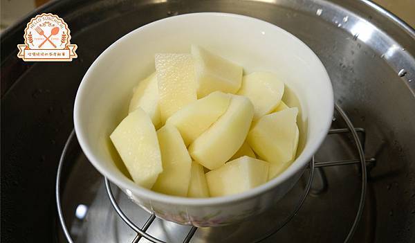 1.馬鈴薯切塊,先放入電鍋蒸軟。